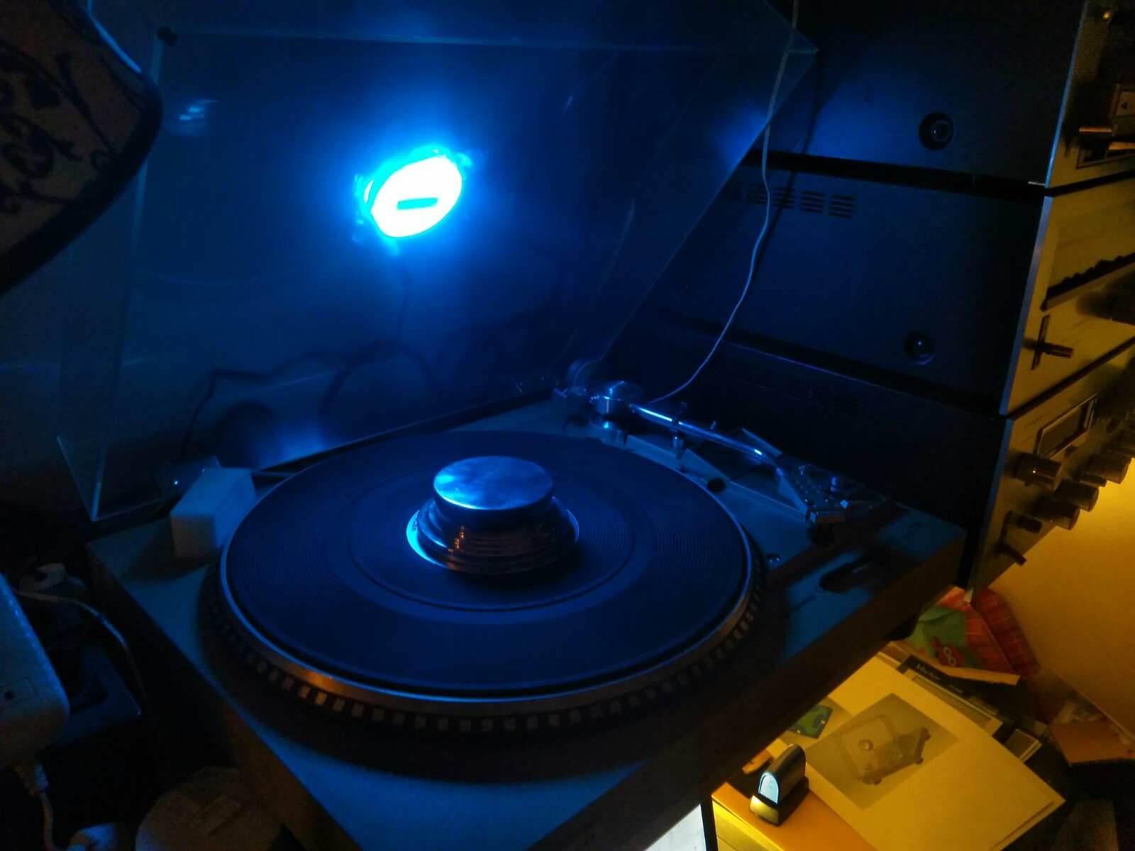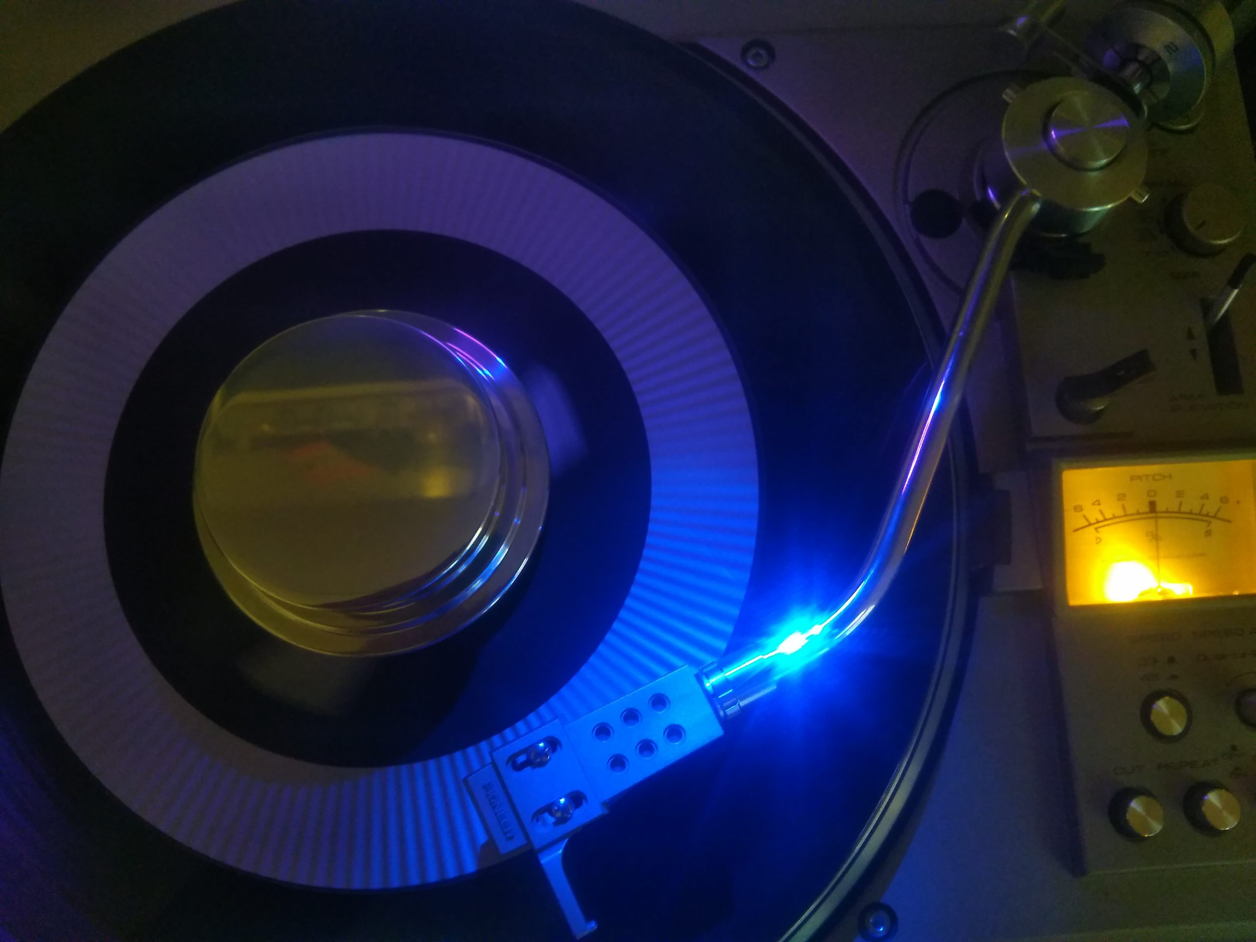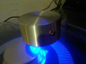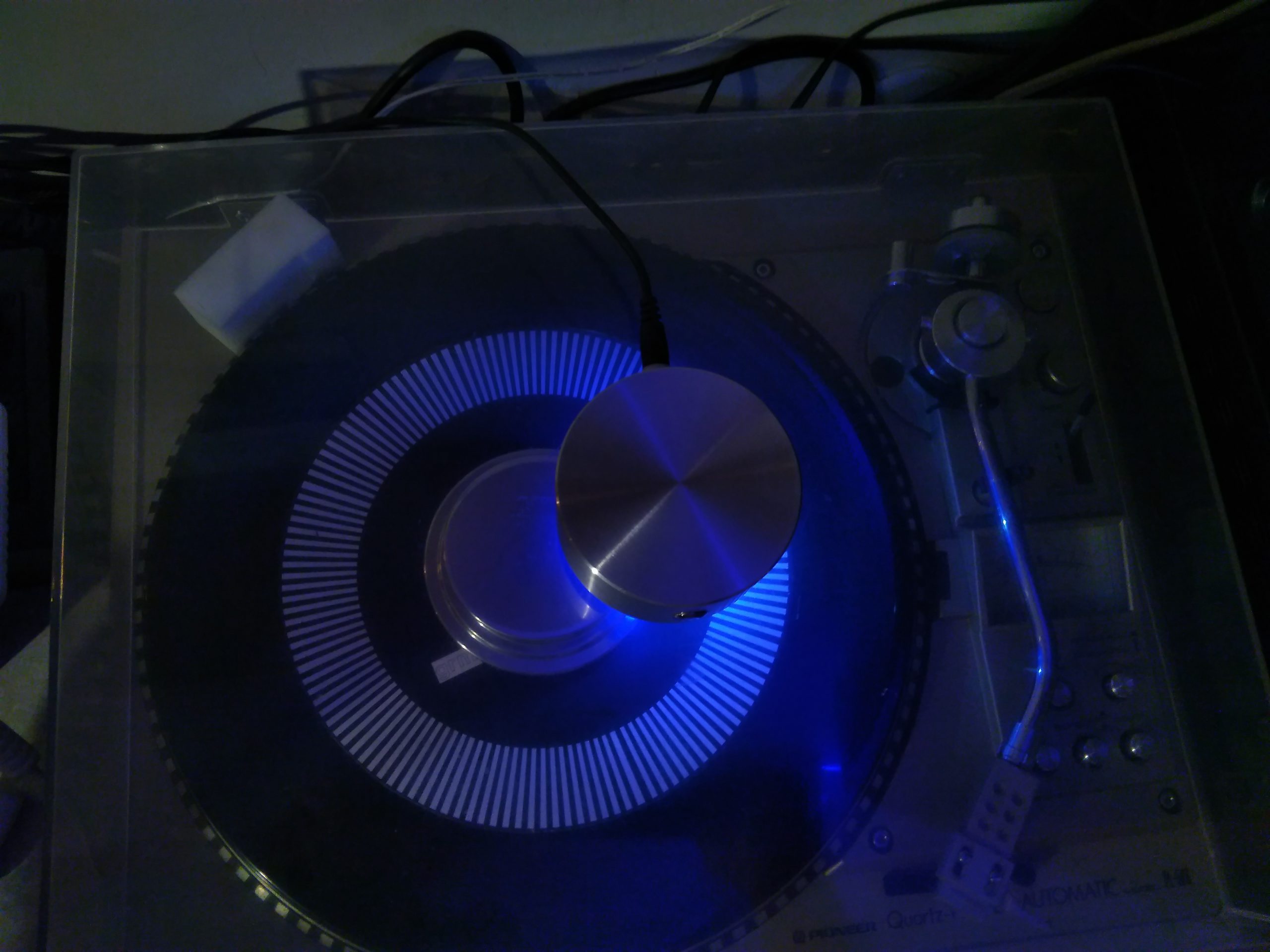 Całość jest wykonana z porządnych materiałów: polerowanego aluminium, warstwa tłumiąca wysokiej jakości ,specjalny sterownik RGB ,kwarcowy układ stroboskopu oraz autorski projekt panelu święcącego LED zaprojektowany i wykonany specjalnie dla tego urządzenia . Równomiernie rozprowadza światło tak, żeby nie raziło, kieruje promienie na boki, żeby oświetlić jak największą cześć gramofonu.
